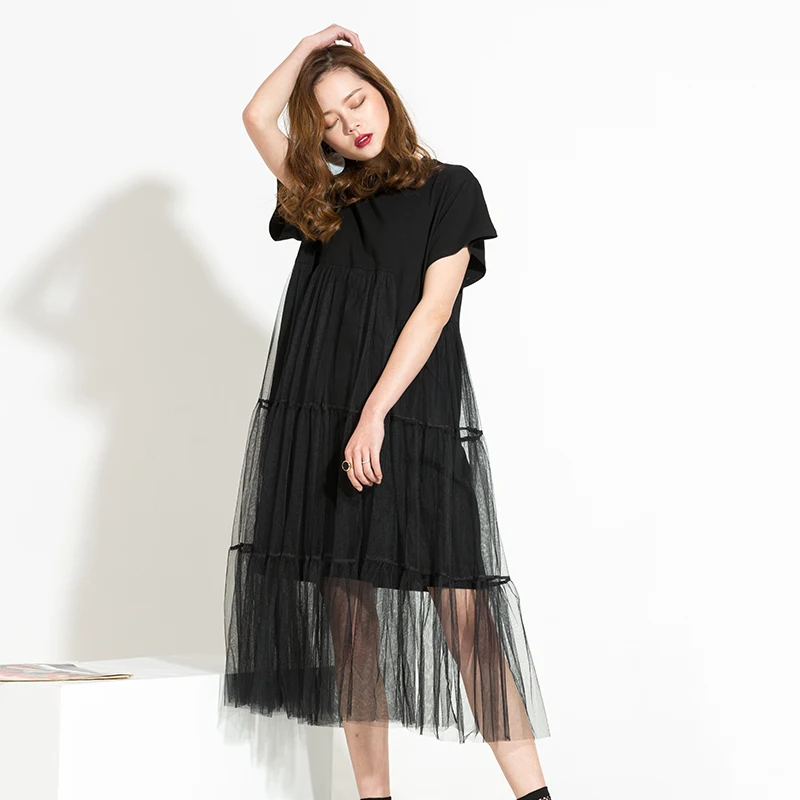 Product Name: [EAM] 2017 autumn Trend New Large Size Long Big Size Net Yarn Spliced Black O neck Short Sleeve Sexy mesh Dress Woman 5XL 3361