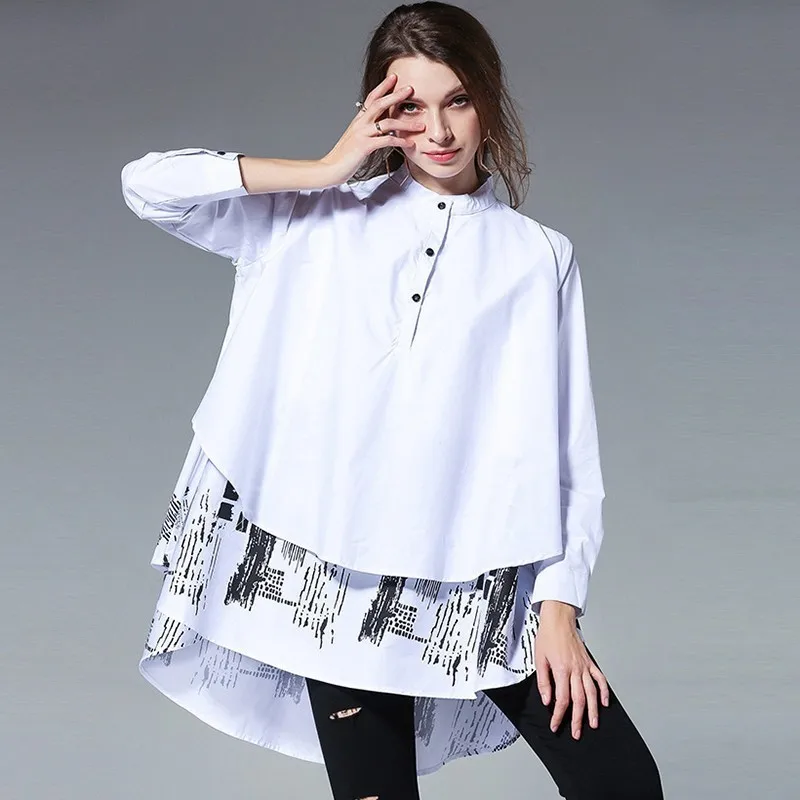 Special Offer [EAM] Новинка 2020, Осень зима, одноцветная блузка с принтом, длинный рукав, соединенная стойка, большой размер, свободная женская рубашка S05600L Discount 18% Today!