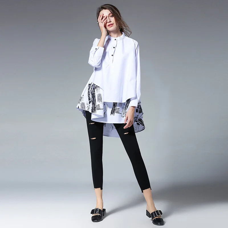 (18% Off) Купить [EAM] Новинка 2020, Осень зима, одноцветная блузка с принтом, длинный рукав, соединенная стойка, большой размер, свободная женская рубашка S05600L Цена Дешево
