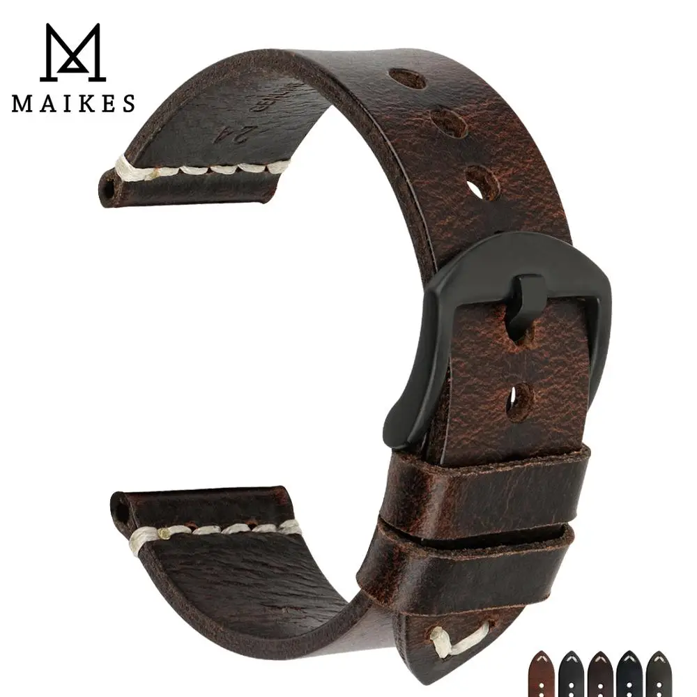 (25% Off) Купить Распродажа MAIKES 20 мм 22 24 Ремешки для наручных часов из натуральной телячьей кожи ретро зернистой нержавеющей стали с пряжкой наручны... Цена Дешево