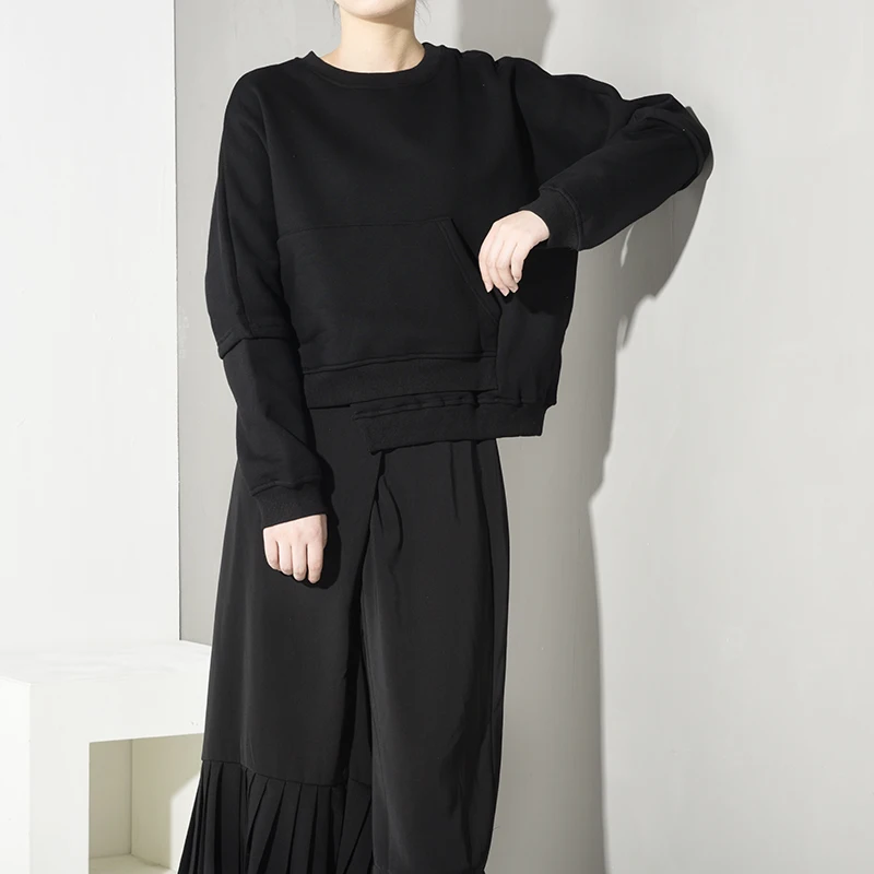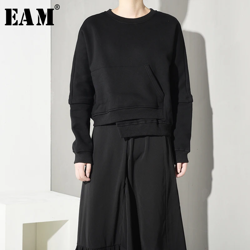 Product Name: [EAM] свободный крой с неровным подолом, большой размер, толстовка с круглым вырезом и длинным рукавом, Женская мода большого размера, Осень зи...