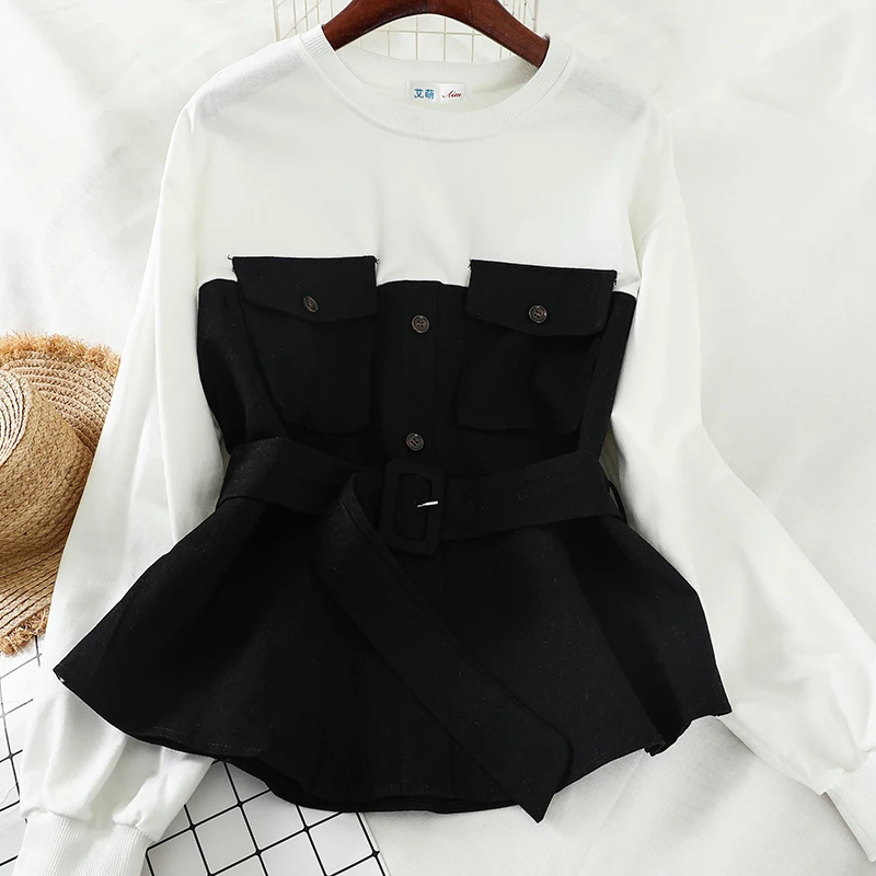 (44% Off) Купить Gagarich женские толстовки Новые Корейские осенние зимние модные карманные Рубашки поддельные две части боди Пояс тонкие винтажные То... Продажа Дешево
