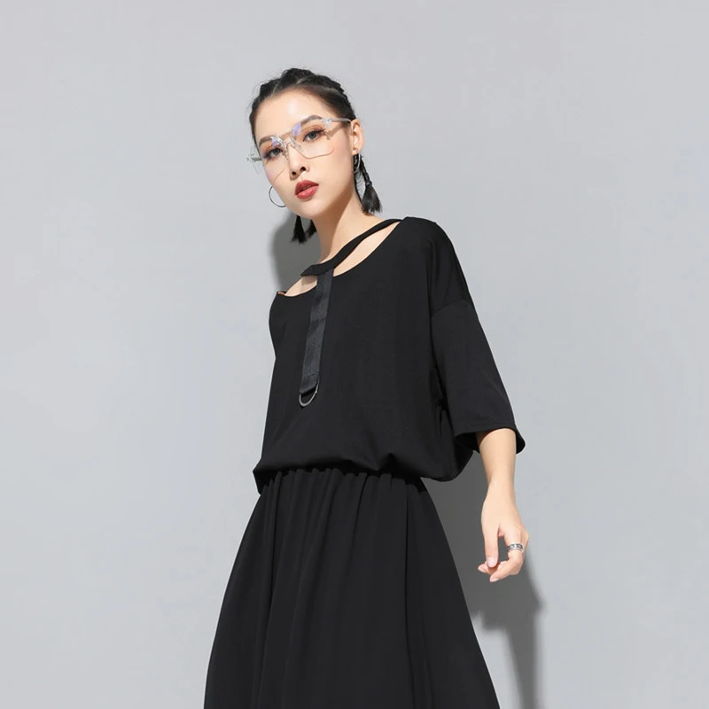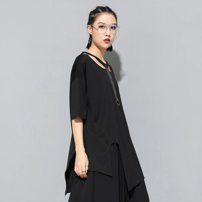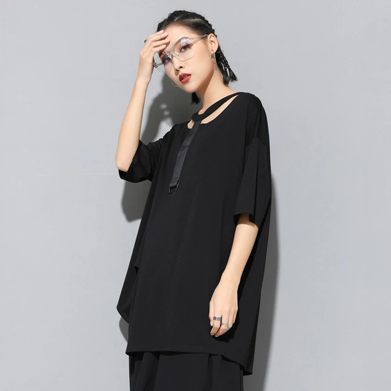 Product Name: [EAM] Новинка 2020, весна лето, круглый вырез, короткий рукав, черный цвет, большой размер, лента, Раздельный шов, футболка, женская мода, JS939