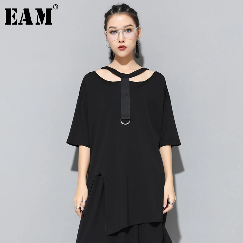 Special Offer [EAM] Новинка 2020, весна лето, круглый вырез, короткий рукав, черный цвет, большой размер, лента, Раздельный шов, футболка, женская мода, JS939 Discount 18% Today!