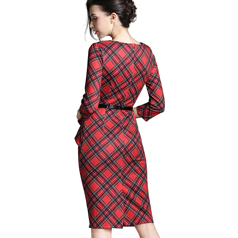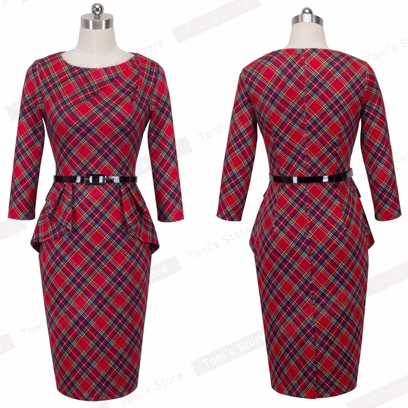 Product Name: Женское винтажное платье карандаш Nice forever, красное платье в клетку с круглым вырезом и рукавом 3 4, Повседневное платье карандаш с баской на м...