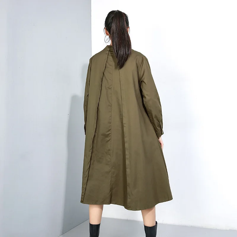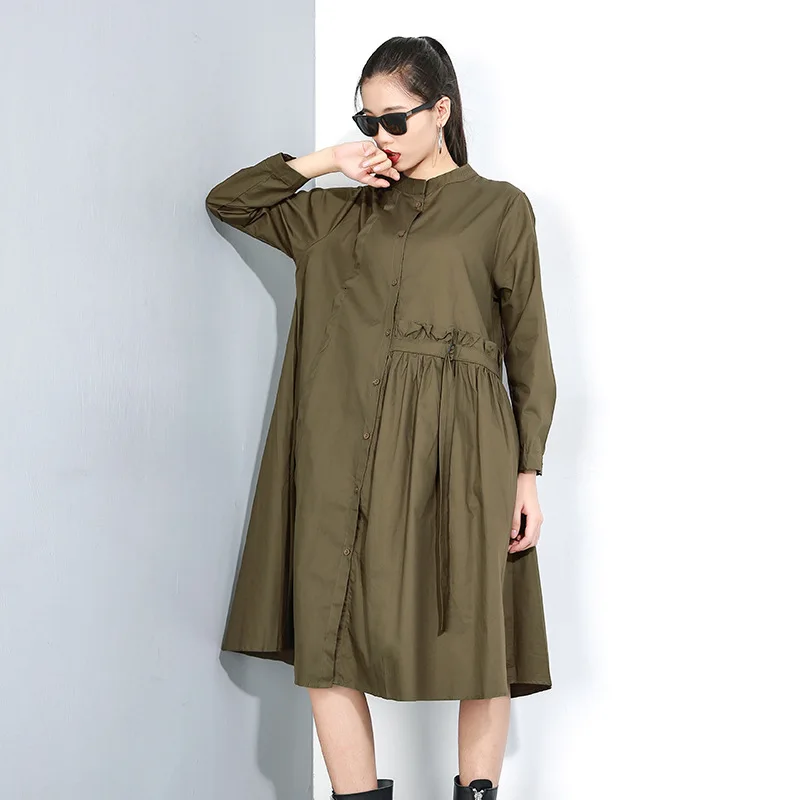 Product Name: [EAM] женское Плиссированное Платье рубашка большого размера с разрезом, новинка, воротник стойка, длинный рукав, свободный крой, мода, весна о...