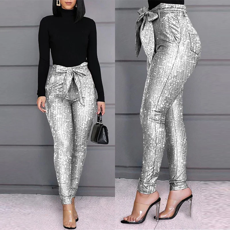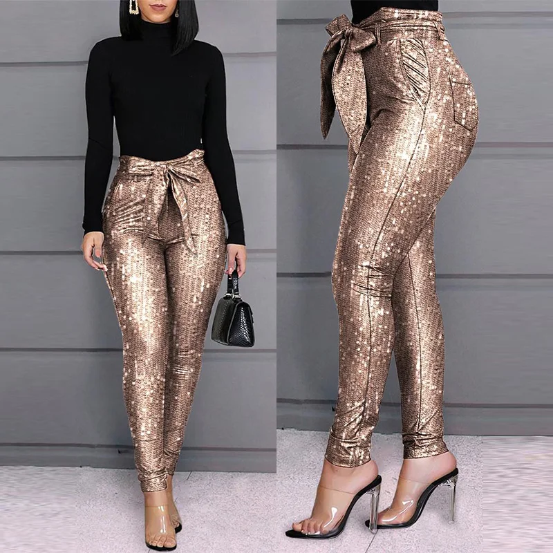 Product Name: Женские узкие брюки с блестками, с поясом, с бантом, с высокой талией, с карманами, дизайнерские узкие брюки, вечерние, клубная одежда