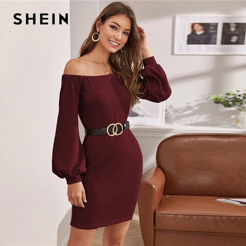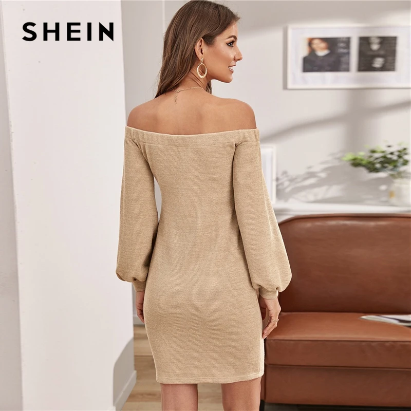 (48% Off) Купить Шеин с открытыми плечами фонарь рукав свитер платье без пояса для женщин Осень Зима сплошной вязаный приталенный элегантный карандаш плать... Продажа Дешево