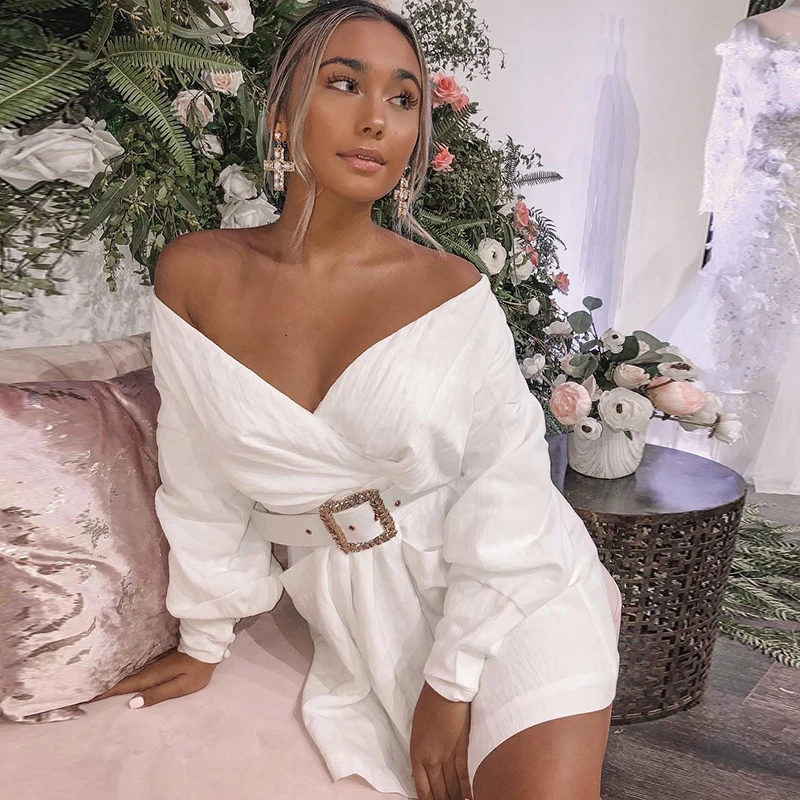 (51% Off) Купить Женское вечернее платье с открытыми плечами NewAsia, белое длинными рукавами фонариками и поясом, бежевое мини платье запахом, осень ... Продажа Дешево