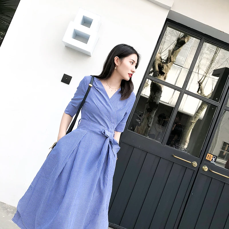 (0% Off) Купить Женское платье средней длины Lachicer, синее в полоску с бантом и поясом, летнее элегантное платье трапеция, 2019 Цена Дешево