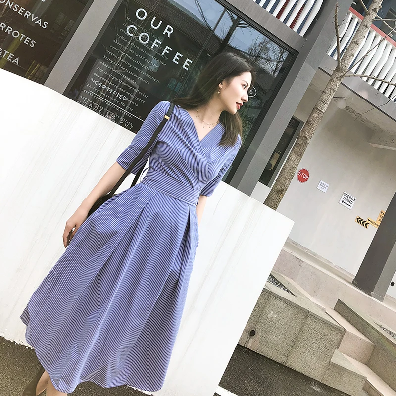 Product Name: Женское платье средней длины Lachicer, синее платье в полоску с бантом и поясом, летнее элегантное платье трапеция, 2019