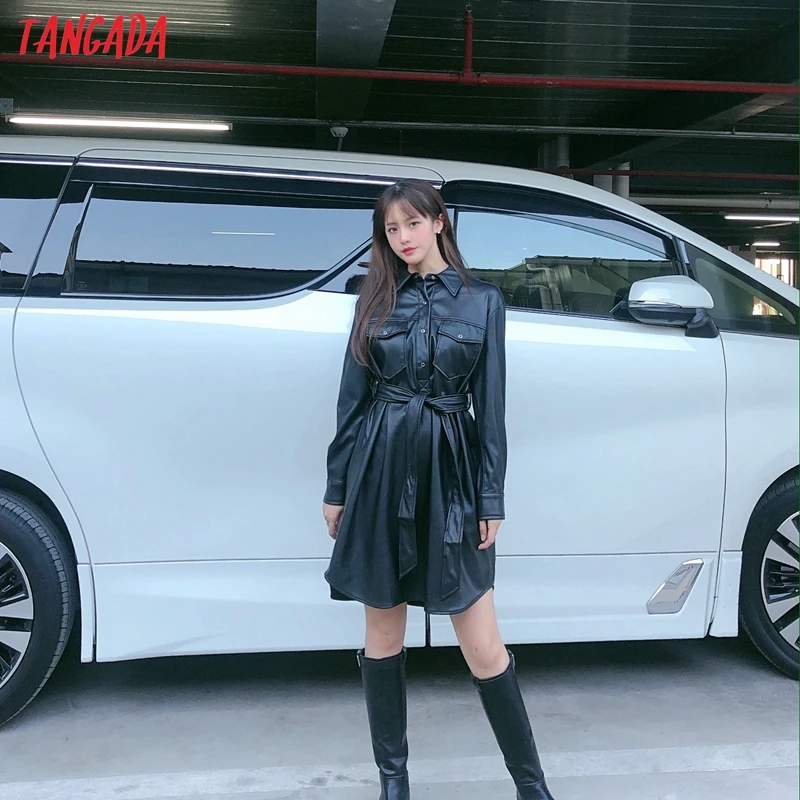 Special Offer Tangada женское платье рубашка из искусственной кожи с поясом и длинным рукавом в стиле ретро элегантное женское черное мини платье vestido JE110 Discount 30% Today!