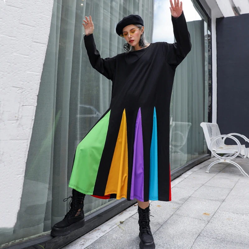Product Name: [EAM] женское разноцветное Полосатое платье большого размера, новинка, круглый вырез, длинный рукав, свободный крой, модная одежда, весна осен...