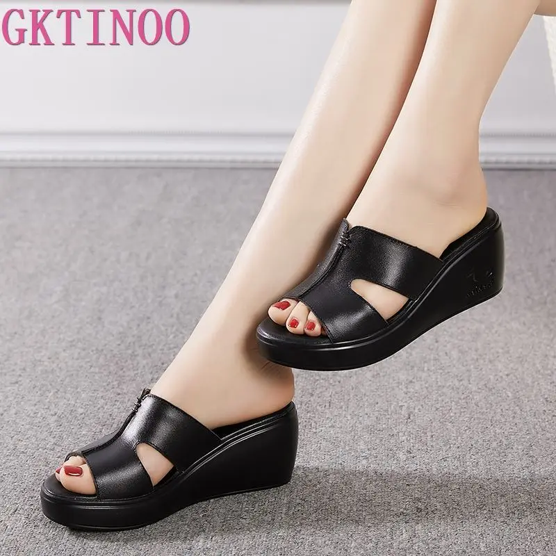 (52% Off) Купить GKTINOO женские вьетнамки на платформе; Новинка 2020 года; летние женские шлепанцы из натуральной кожи; обувь высоком каблуке; шлепанц... Цена Дешево