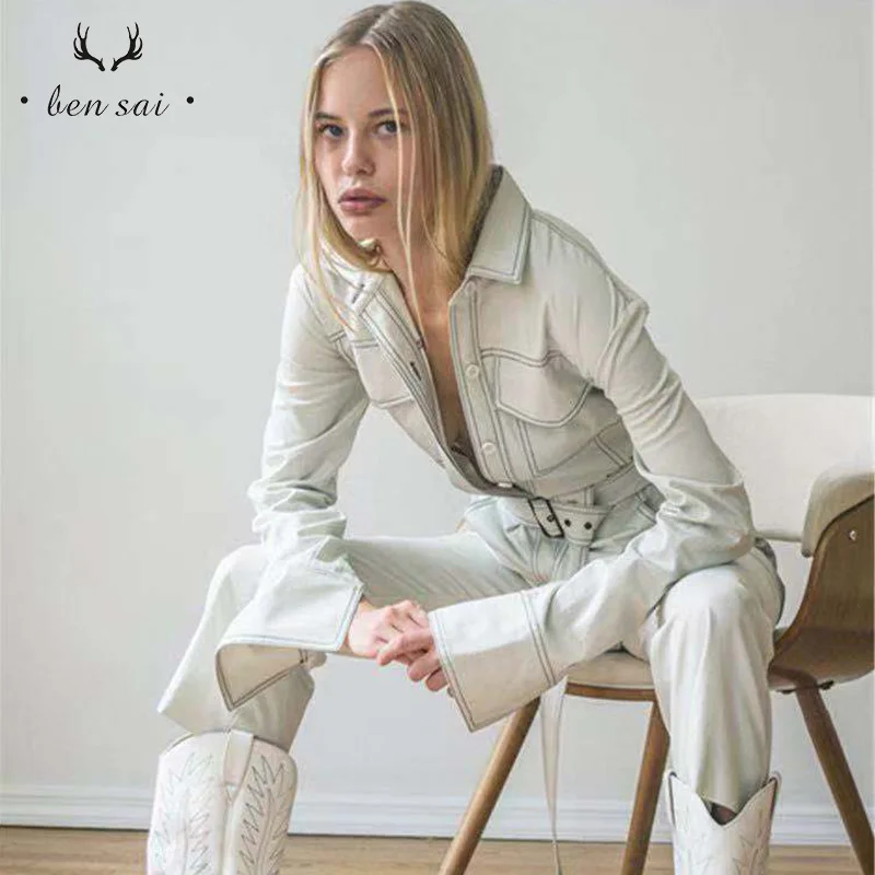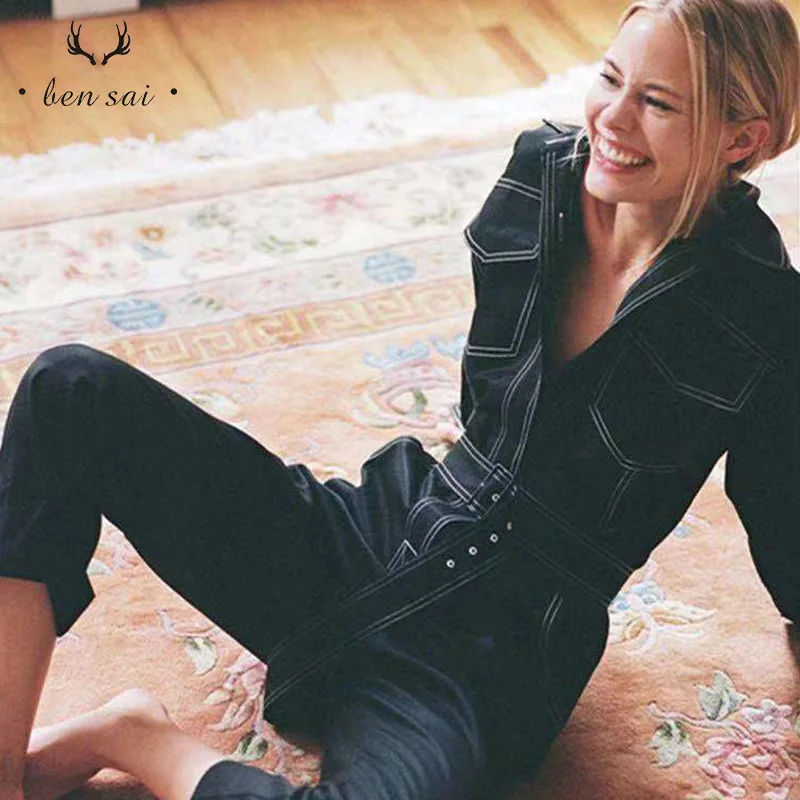 (0% Off) Купить Женский джинсовый сексуальный комбинезон, комбинезон с длинным рукавом и поясом, черный, белый, хаки, женский женские ... Цена Дешево