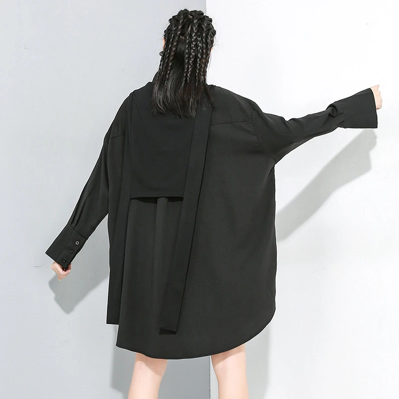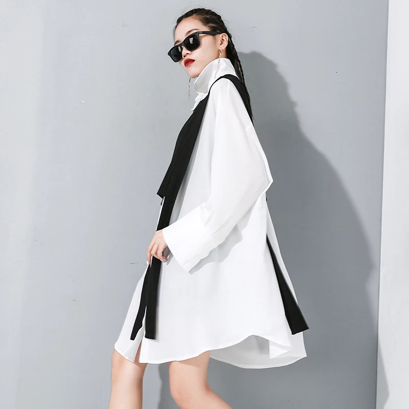 Product Name: [EAM] Женская черная блузка с разрезом большого размера из двух частей, новая свободная рубашка с отворотом и длинным рукавом, модная весенняя...