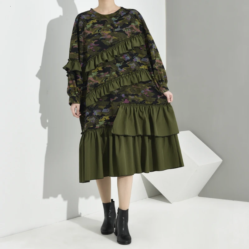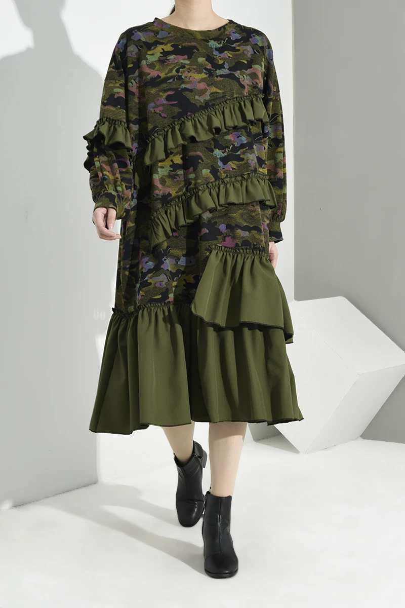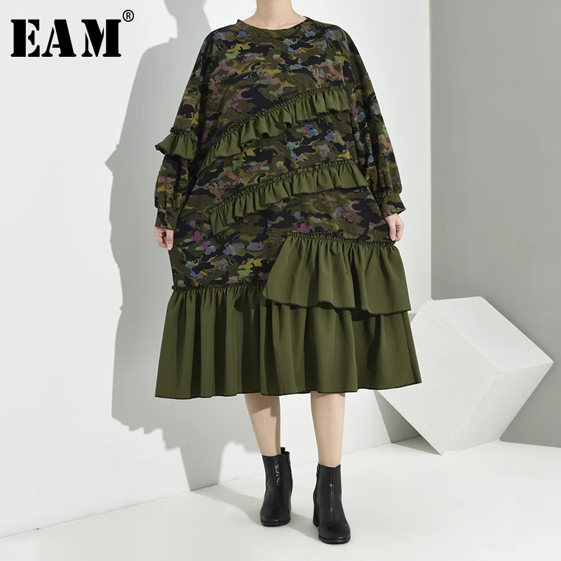 Product Name: [EAM] женское камуфляжное платье с оборками большого размера, новинка, круглый вырез, длинный рукав, свободный крой, мода, весна осень 2020, 1D5260