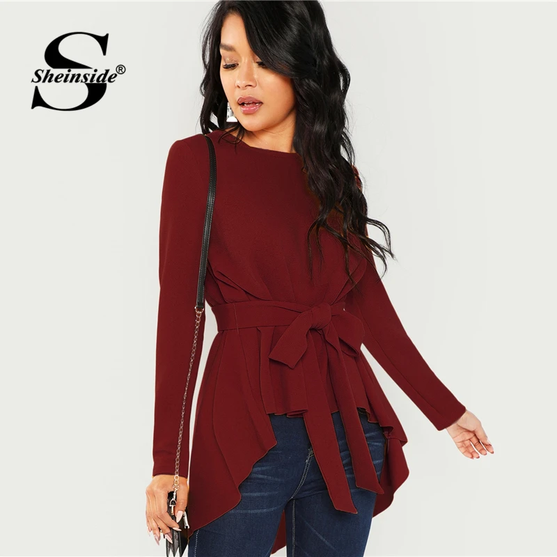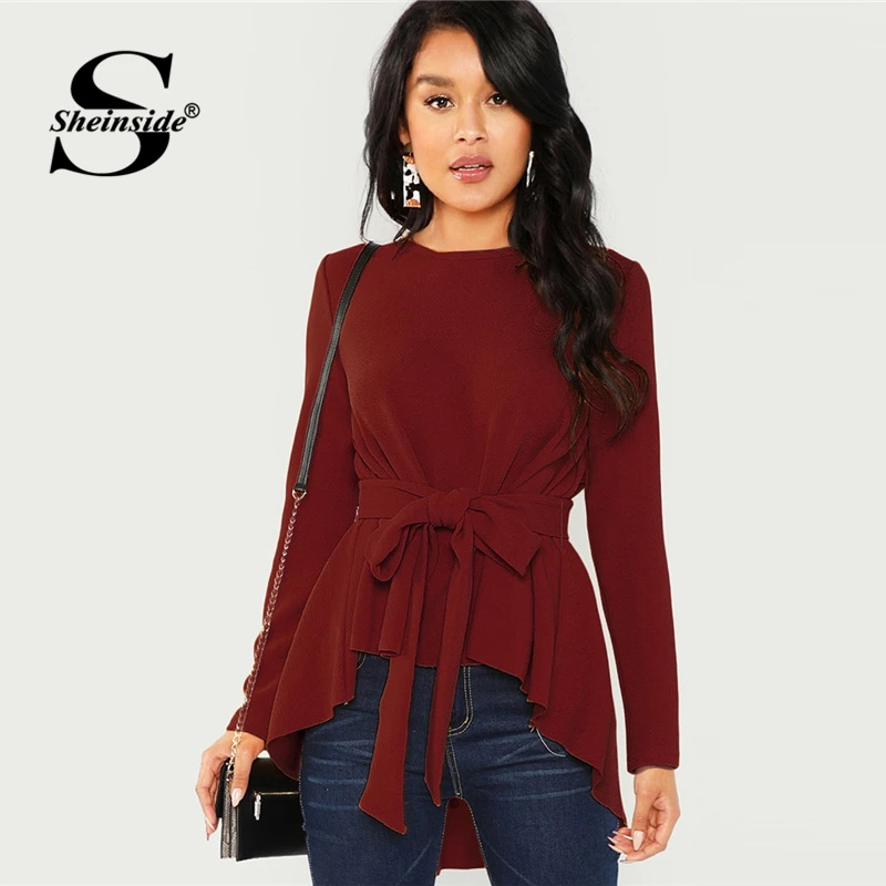 (41% Off) Купить Sheinside, Бордовая рубашка с длинным рукавом, женская элегантная блузка, 2018, Женский Топ поясом, асимметричный подол, Женские топы и блузки Цена Дешево