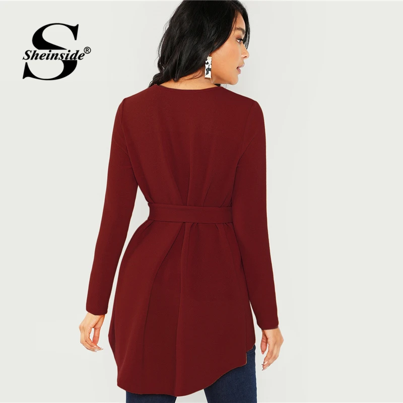 Special Offer Sheinside, Бордовая рубашка с длинным рукавом, женская элегантная блузка, 2018, Женский Топ с поясом, асимметричный подол, Женские топы и блузки Discount 41% Today!