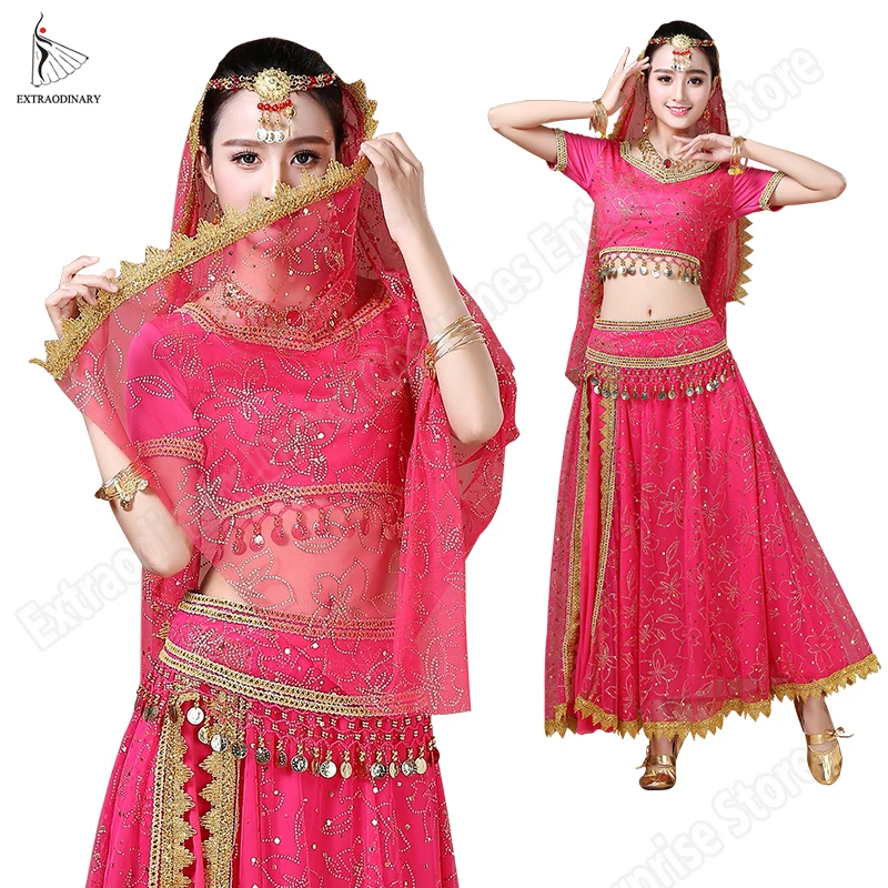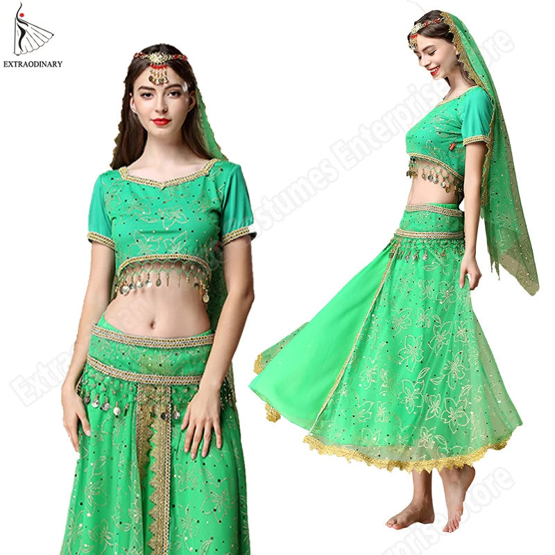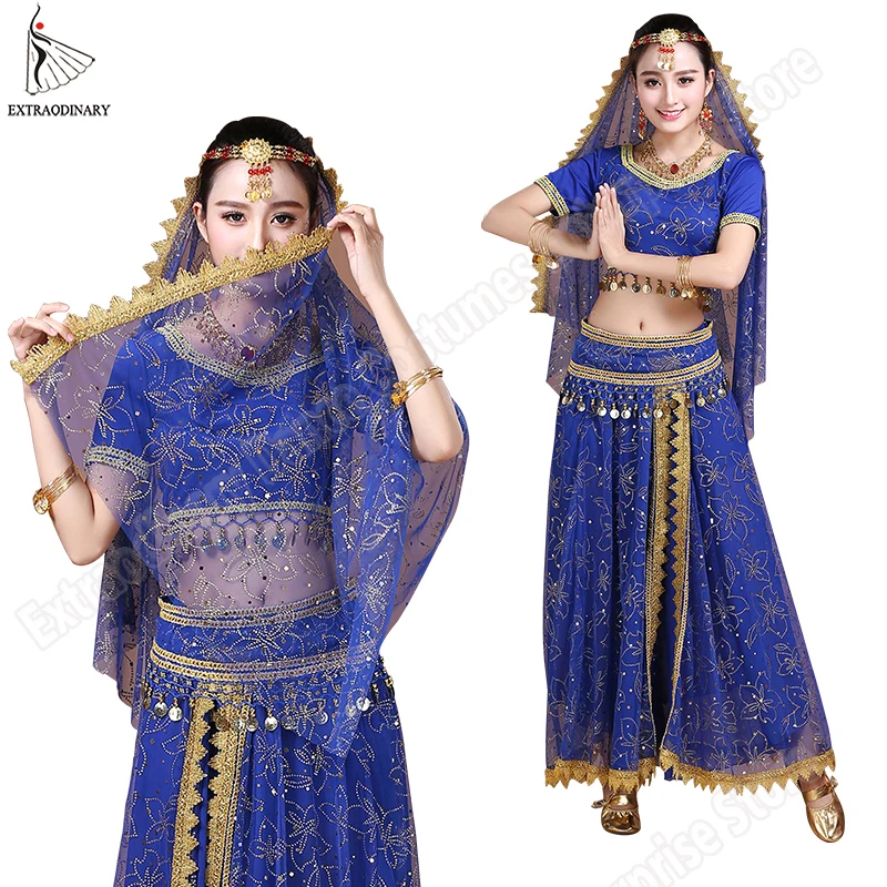 (43% Off) Купить Набор костюма для танца живота из Болливуда индийское танцевальное сари костюм с юбкой шифона 5 шт. (головной убор вуаль топ юбка поясом) Цена Дешево
