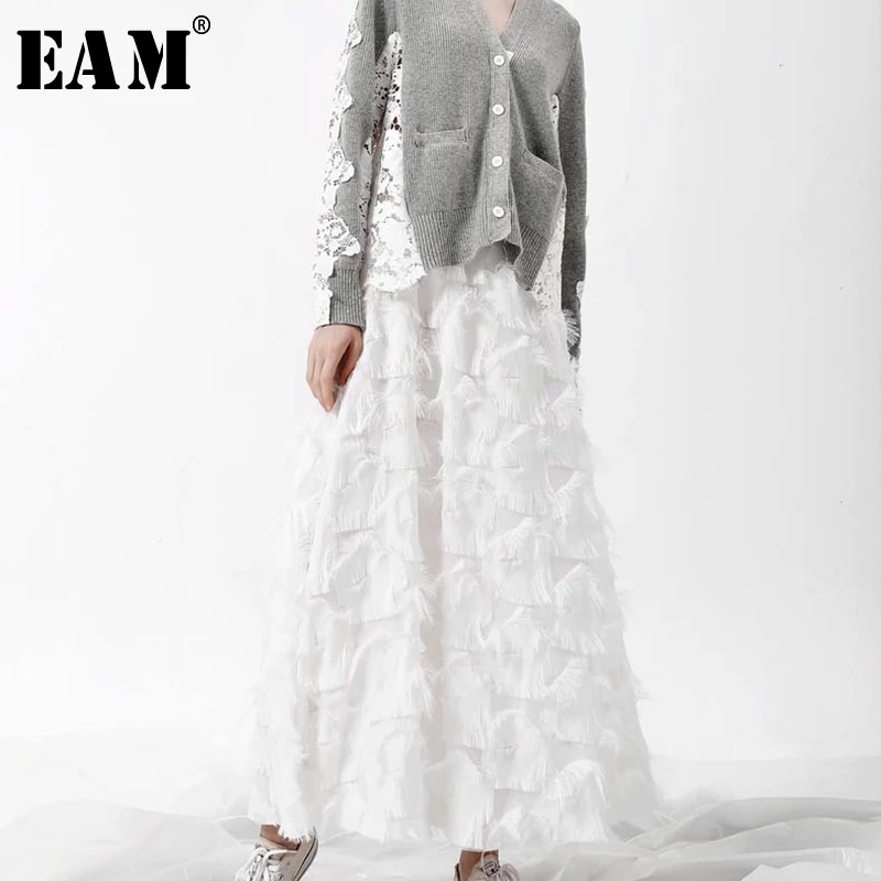 (18% Off) Купить [EAM] 2020 Весенняя Новинка, модная черно белая юбка с кисточками, прошитая большой маятник, длинный тип, полубоди, Женская YC237 Продажа Дешево
