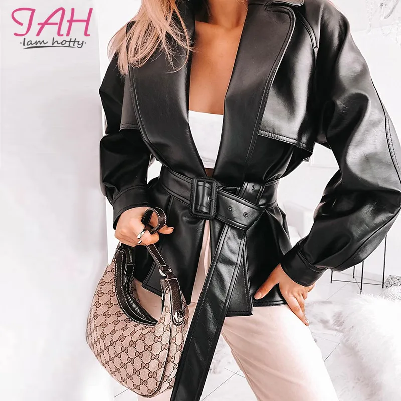 Product Name: IAMHOTTY черные модные женские Куртки из искусственной кожи с поясом в стиле панк; мотоциклетная и Байкерская ветровка; однотонная зимняя тепла...