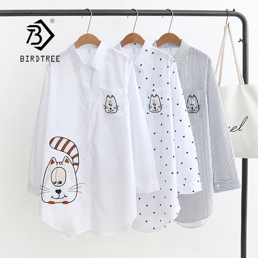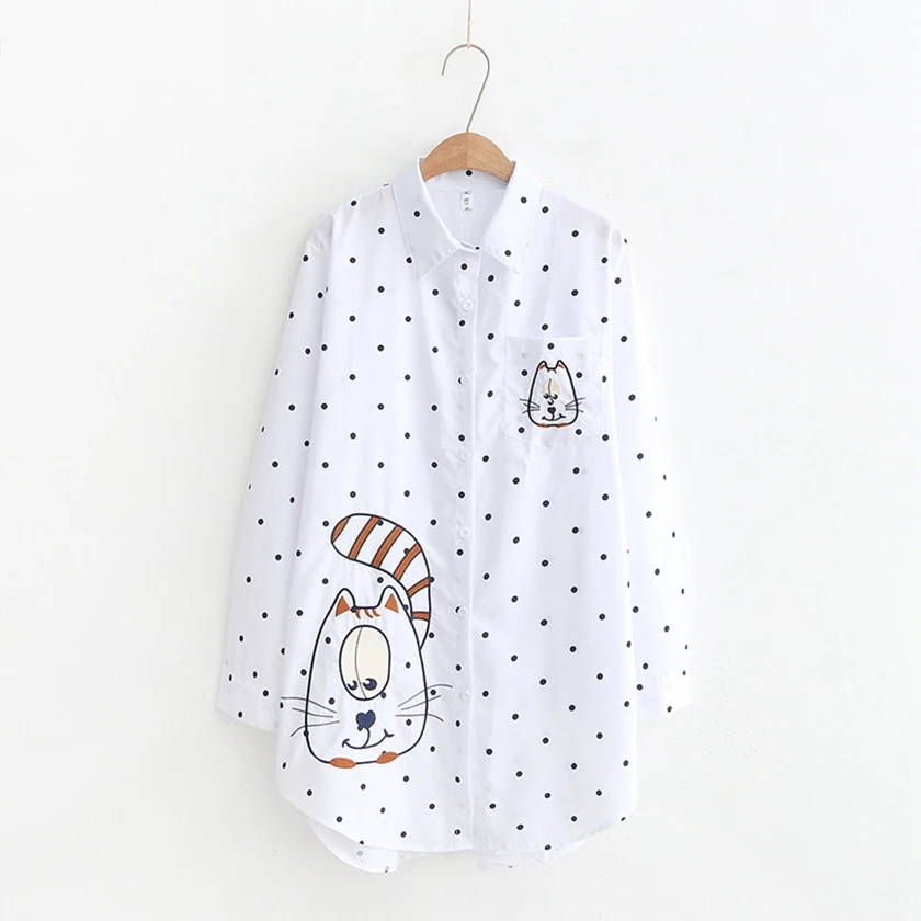 Product Name: Новое поступление, длинная белая блузка с вышивкой и большим лицом кота, Повседневная хлопковая рубашка в полоску и горошек, Свободный Топ, ...