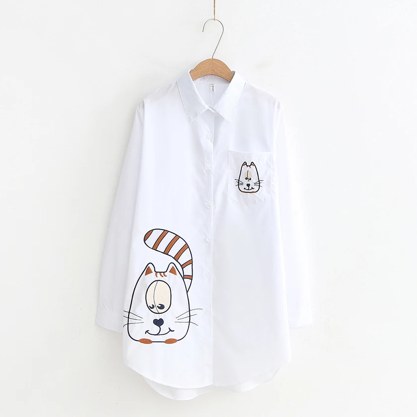 Special Offer Новое поступление, длинная белая блузка с вышивкой и большим лицом кота, Повседневная хлопковая рубашка в полоску и горошек, Свободный Топ, ... Discount 41% Today!