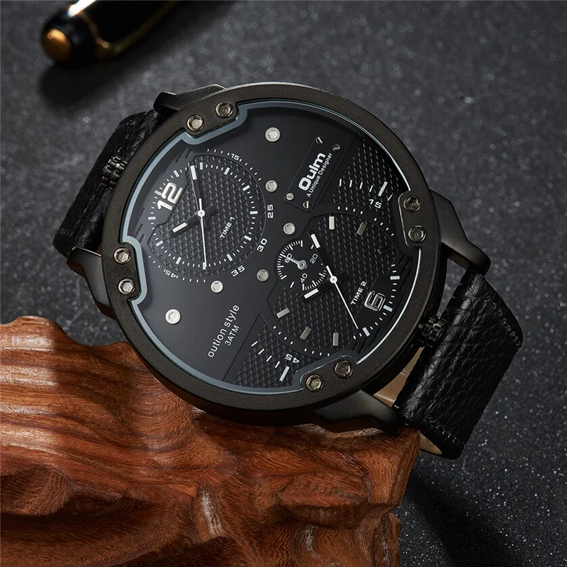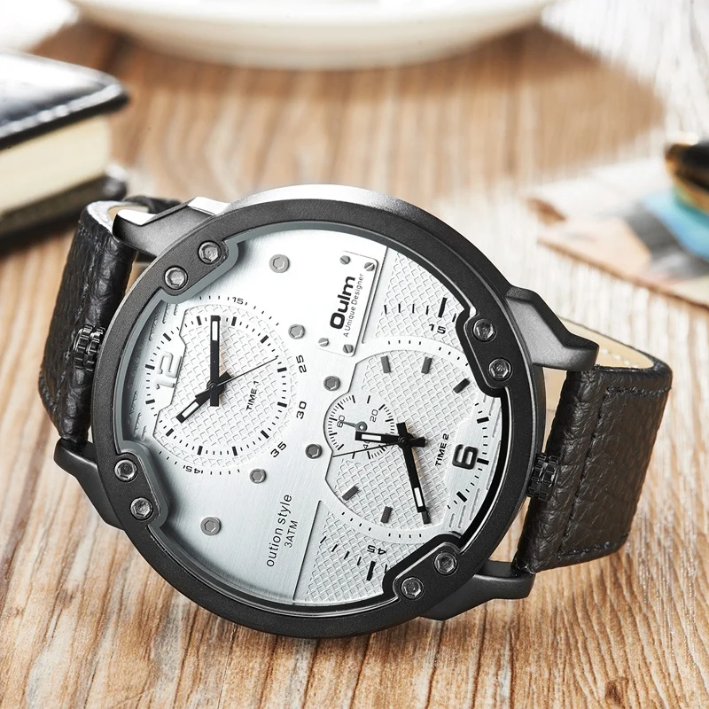 Product Name: Oulm Мужские повседневные спортивные часы Уникальный дизайн большие часы Мужские кварцевые часы с кожаным ремешком с двойным часовым поясом ...