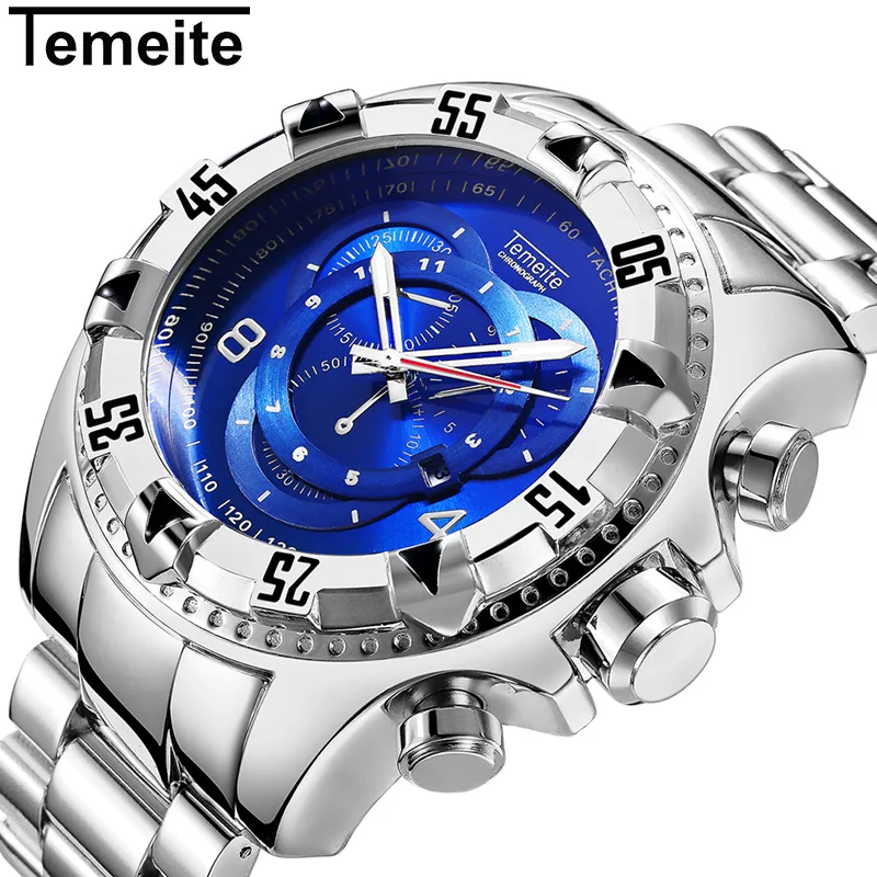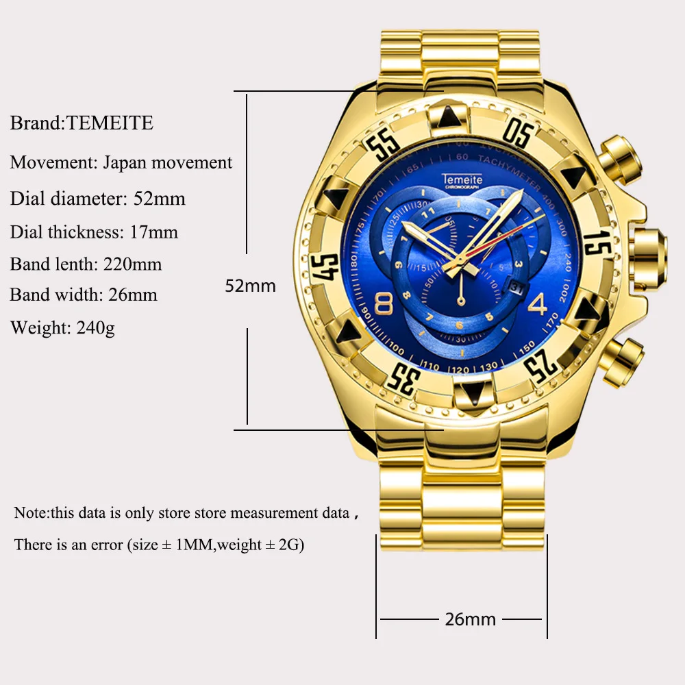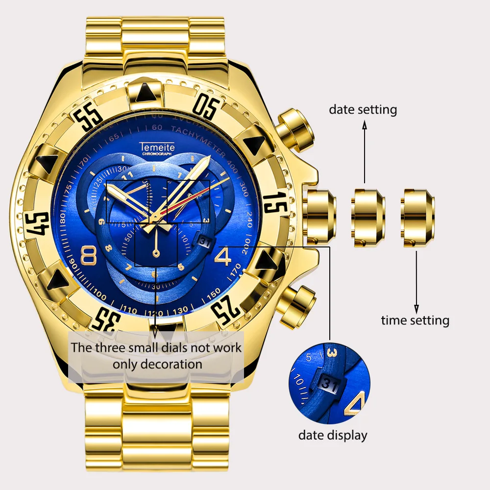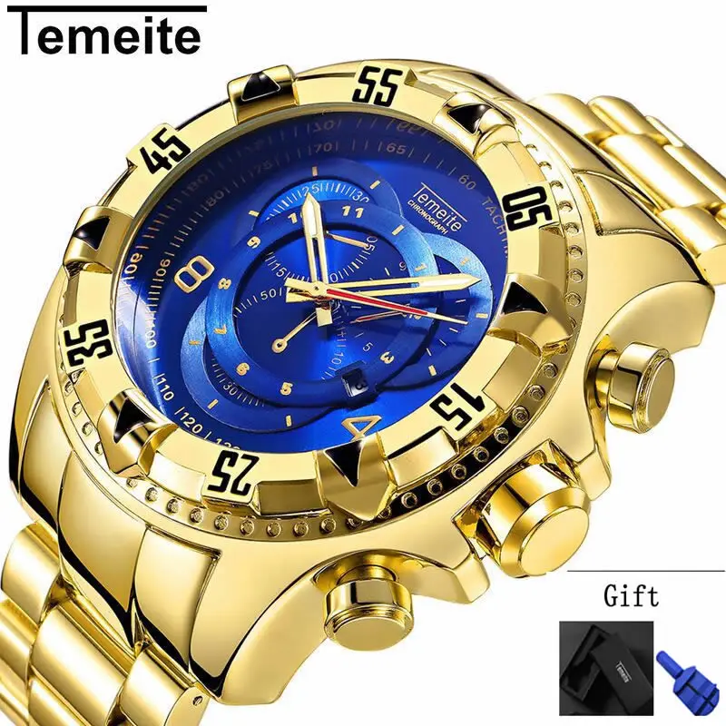 (54% Off) Купить Мужские большой циферблат часы роскошные золотые 316L нержавеющая сталь кварцевые мужские наручные водонепроницаемый календарь Temeite Бр... Цена Дешево