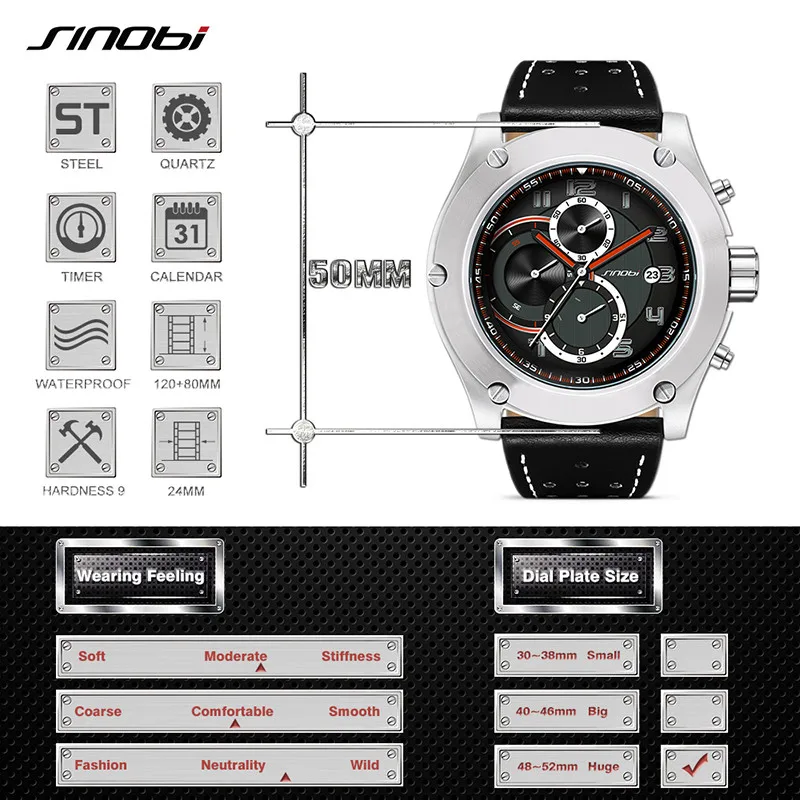 (54% Off) Купить SINOBI, водонепроницаемые кварцевые часы с хронографом и календарем в стиле милитари, Relogio Masculino, спортивные большим циферблат... Продажа Дешево