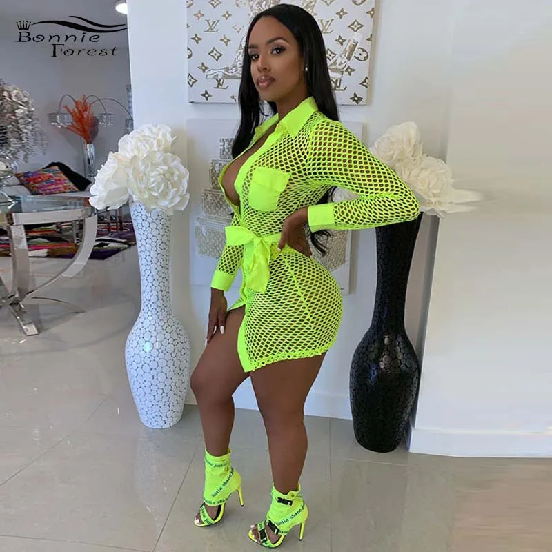 Special Offer Bonnie Forest сексуальное открытое платье с отложным воротником и поясом мини платье женские карманные детали, платье из сетчатой ткани, чувством... Discount 20% Today!