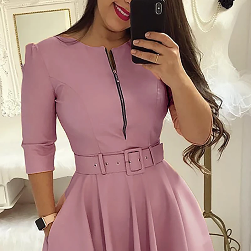 Product Name: Женское платье туника трапециевидной формы, однотонное Плиссированное Повседневное платье средней длины на молнии, для вечеринок, 2019