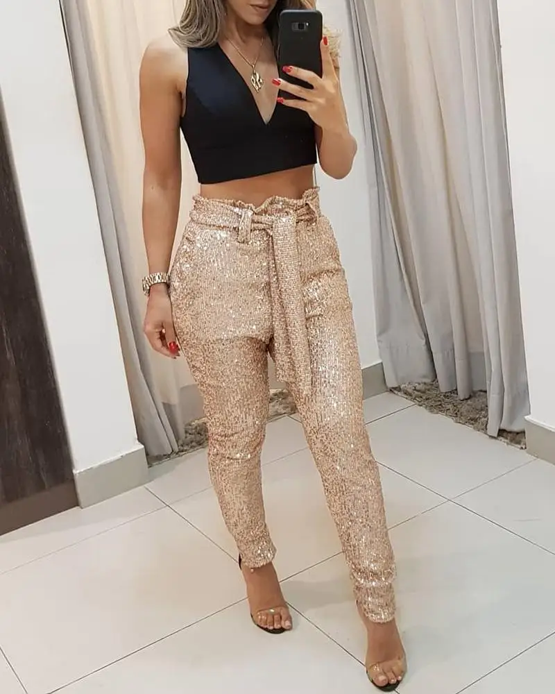 Product Name: 2019 блестящие облегающие брюки карандаш с поясом, однотонные черные Золотые женские шикарные вечерние Брюки для ночного клуба
