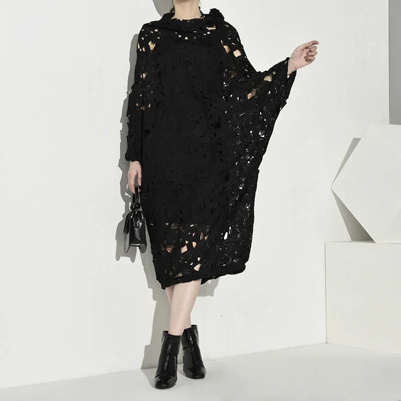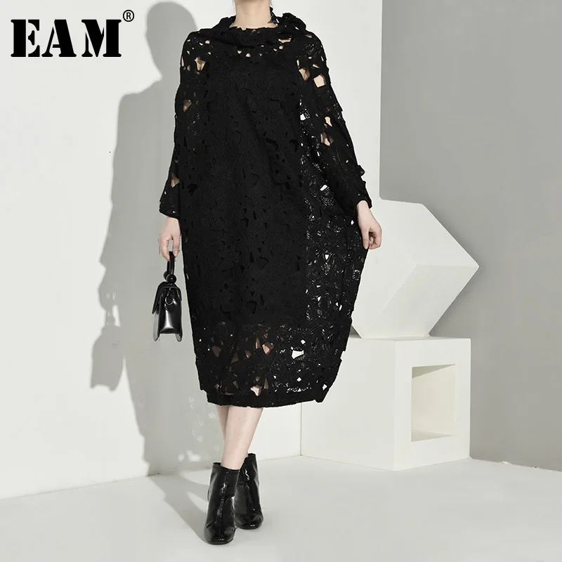 Special Offer [EAM] женское черное кружевное платье большого размера, новинка, круглый вырез, длинный рукав, свободный крой, мода, весна осень 2020 Q09101 Discount 33% Today!