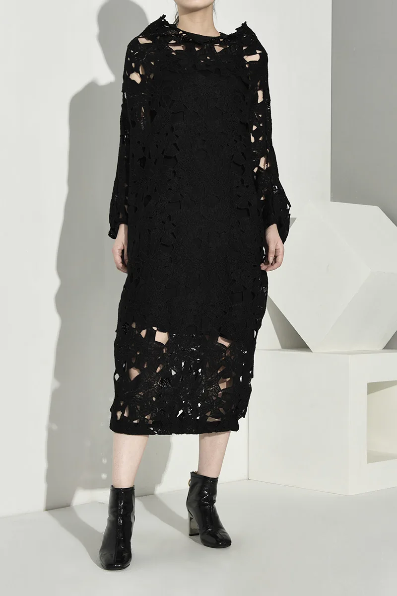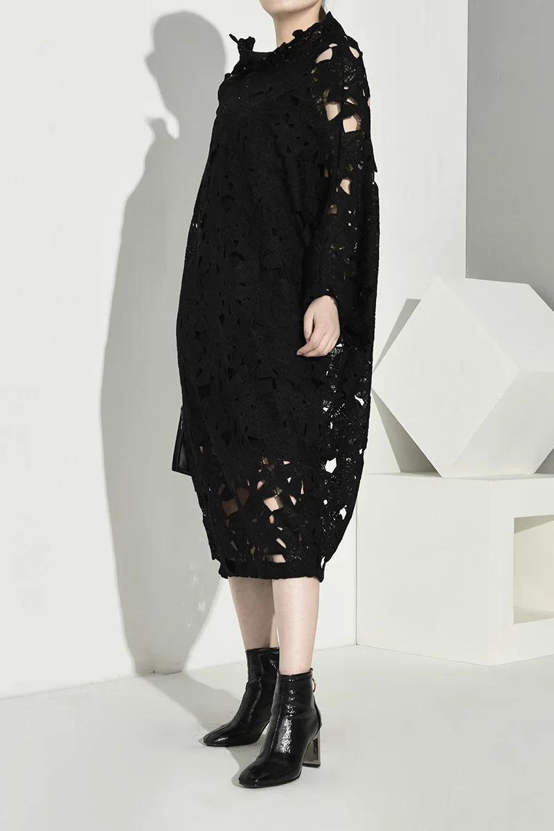 Product Name: [EAM] женское черное кружевное платье большого размера, новинка, круглый вырез, длинный рукав, свободный крой, мода, весна осень 2020 Q09101