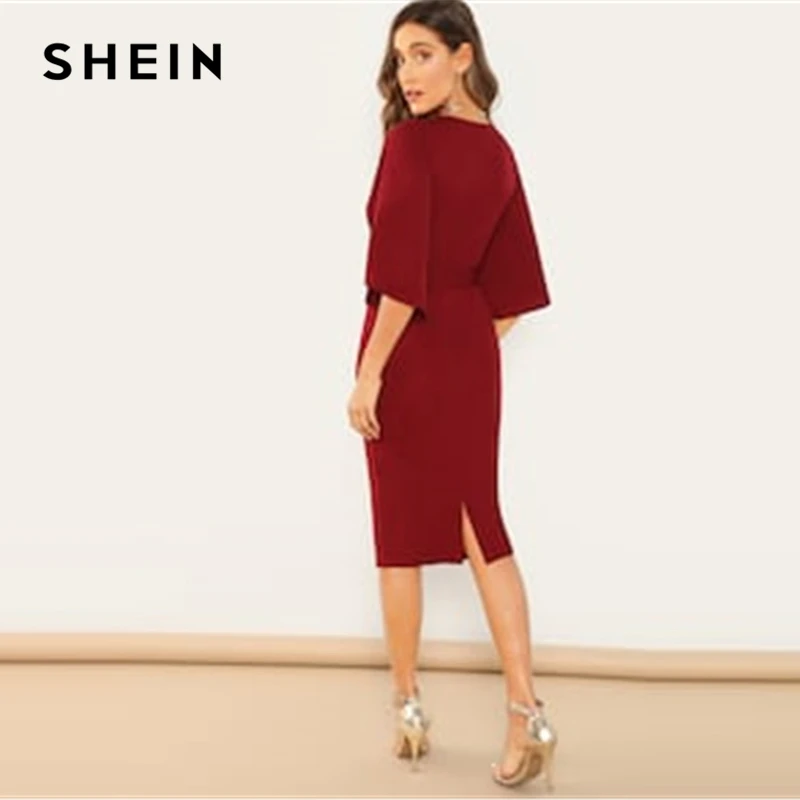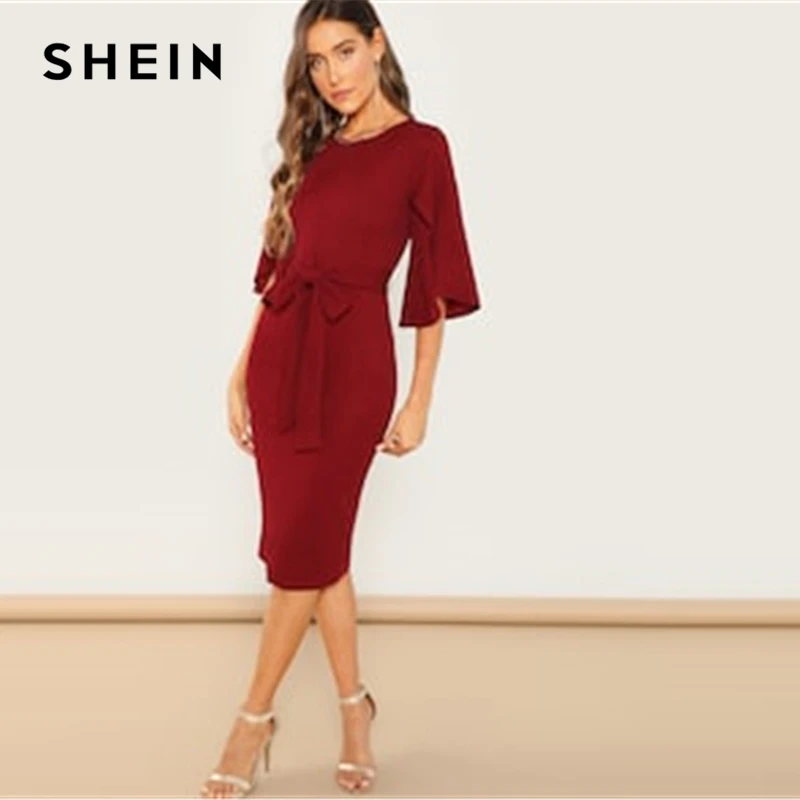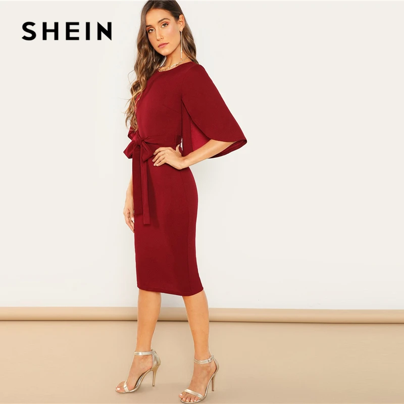 Special Offer SHEIN Повседневное платье карандаш с круглым вырезом и рукавами крылышками, с поясом, Осенние современные женские повседневные платья Discount 42% Today!
