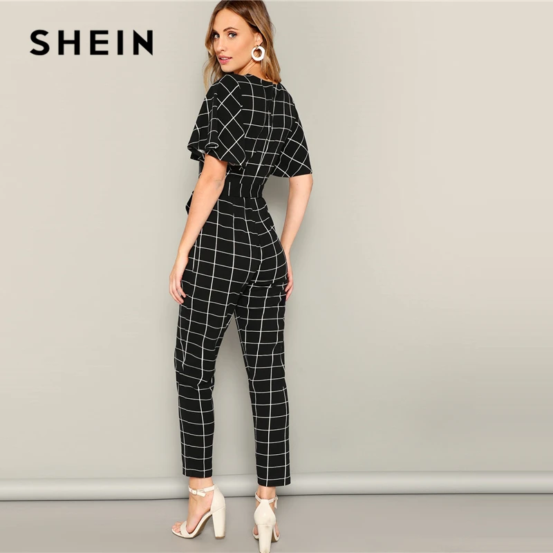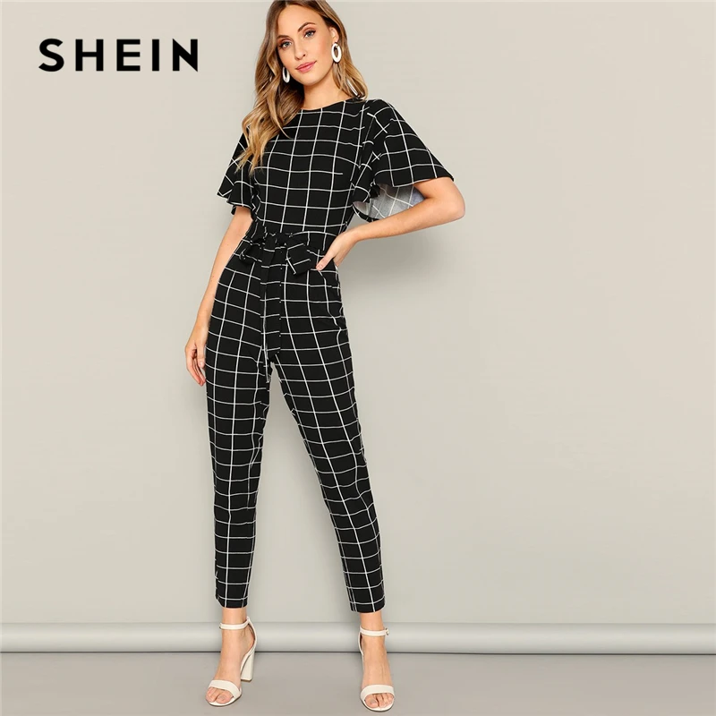 Special Offer SHEIN Элегантный Комбинезон В Клетку С Оригинальным Рукавом И Поясом Комбинезон С Завышенной Талией Discount 42% Today!