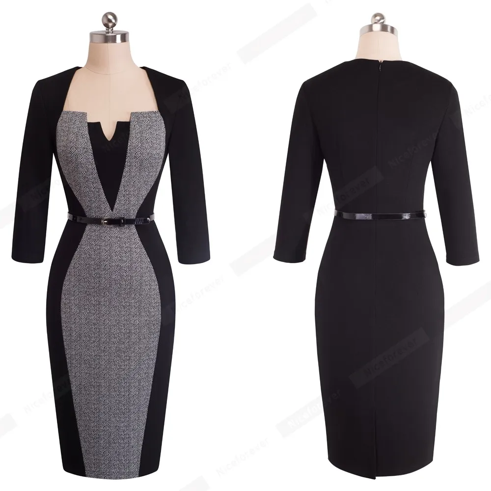 (32% Off) Купить Женское элегантное платье с оптической иллюзией в стиле пэчворк, контрастное винтажное весенне осеннее офисное облегающее поясом ... Цена Дешево