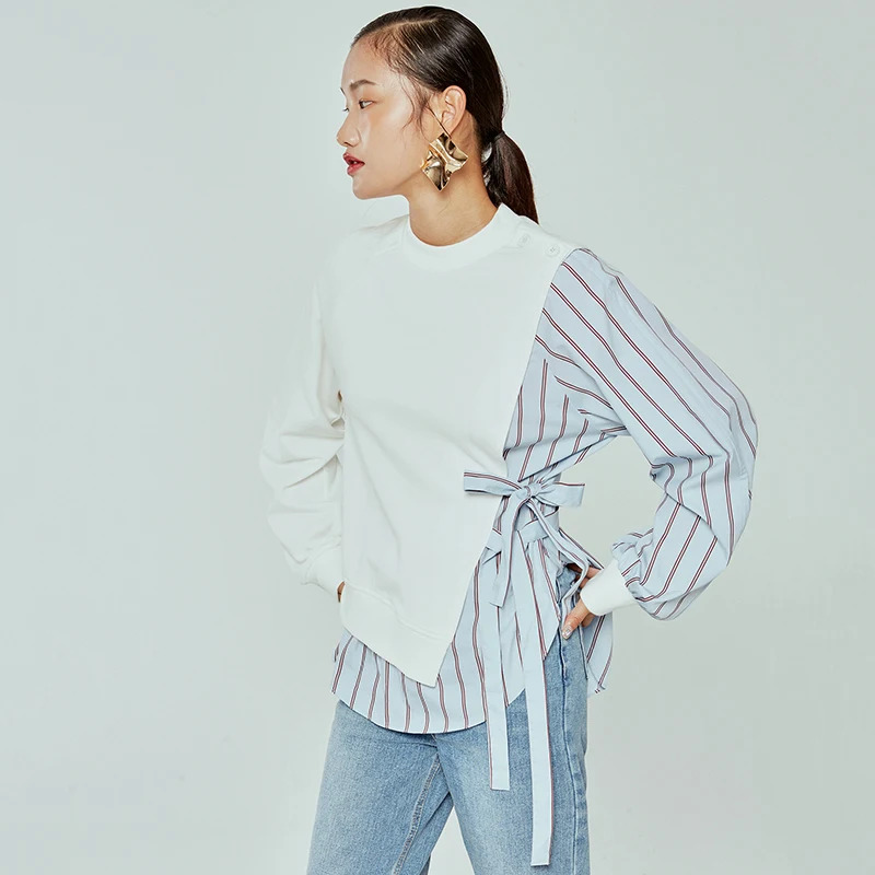 (33% Off) Купить [EAM] Свободная полосатая комбинированная цветная толстовка, новинка, круглый вырез, длинный рукав, женская мода, большой размер, Осень зима ... Цена Дешево