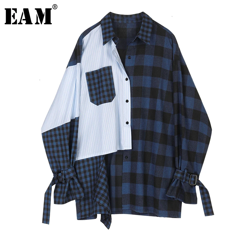 Special Offer [EAM] женская синяя полосатая Клетчатая блуза большого размера, новая свободная рубашка с отворотом и длинным рукавом, модная весенняя Осення... Discount 33% Today!