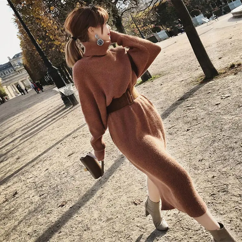 Special Offer Женское платье свитер с высоким воротником и поясом, повседневный свободный трикотажный пуловер с длинными рукавами, длинное зимнее рождес... Discount 36% Today!