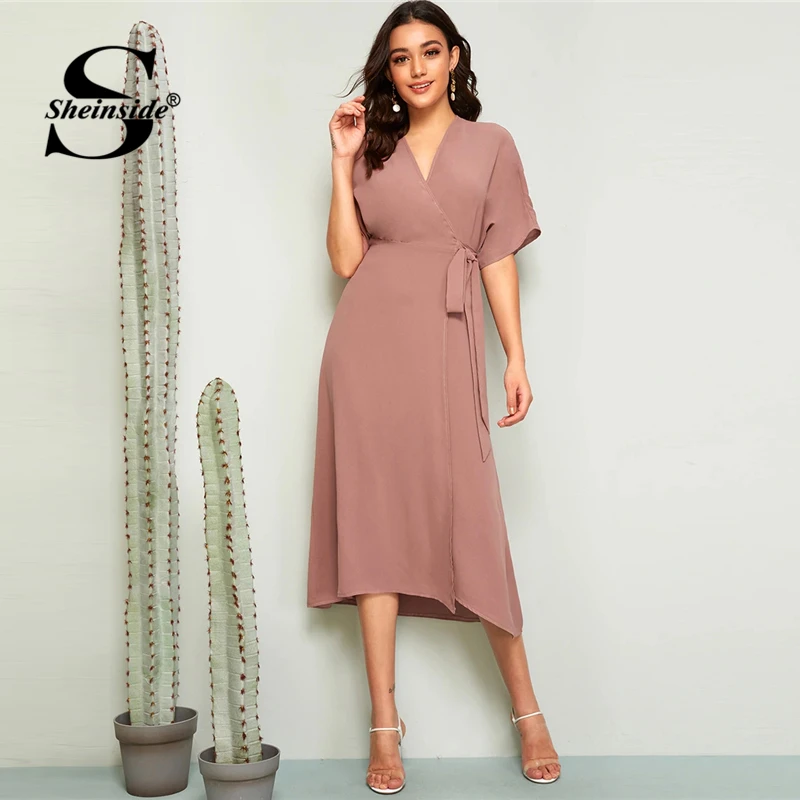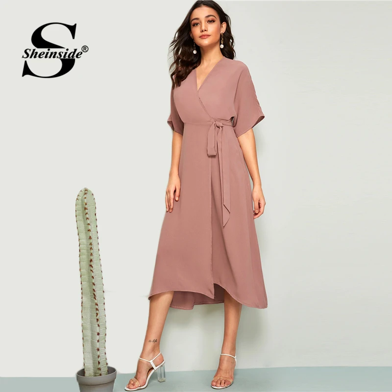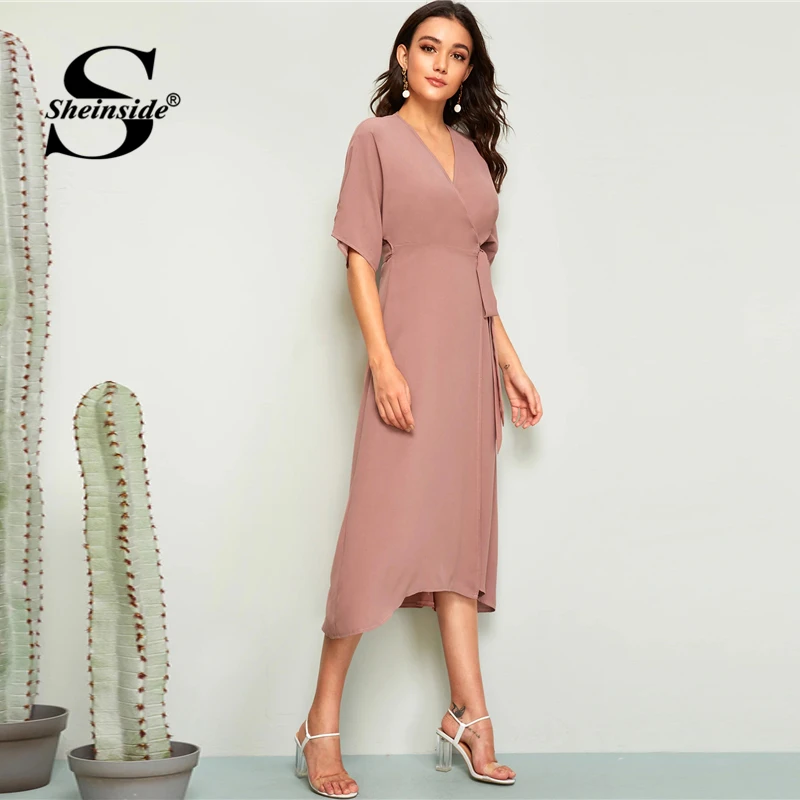 (46% Off) Купить Sheinside элегантное розовое платье с V образным вырезом и поясом для женщин 2019 весенние прямые платья коротким рукавом женские повседневные о... Продажа Дешево