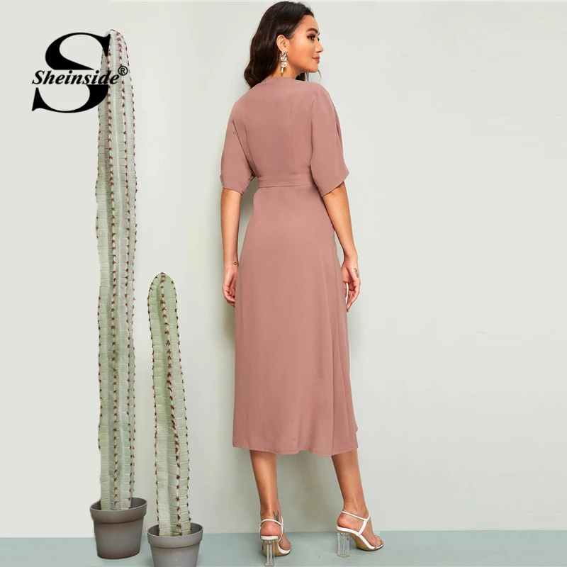 Product Name: Sheinside элегантное розовое платье с v образным вырезом и поясом для женщин 2019 весенние прямые платья с коротким рукавом женские повседневные о...