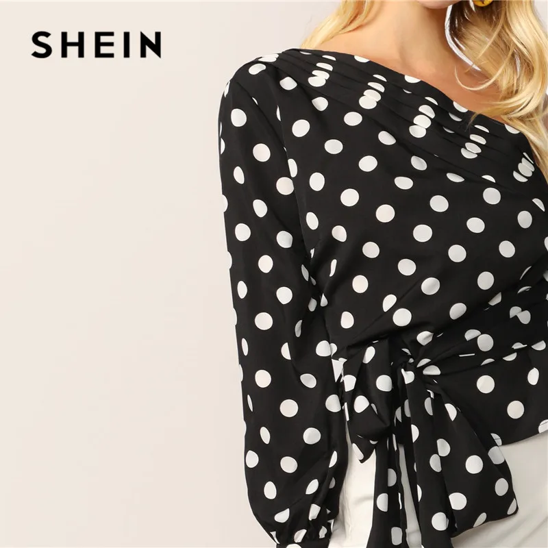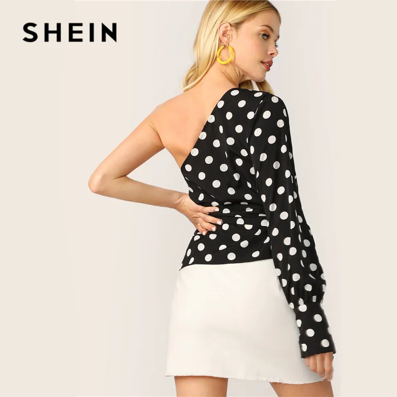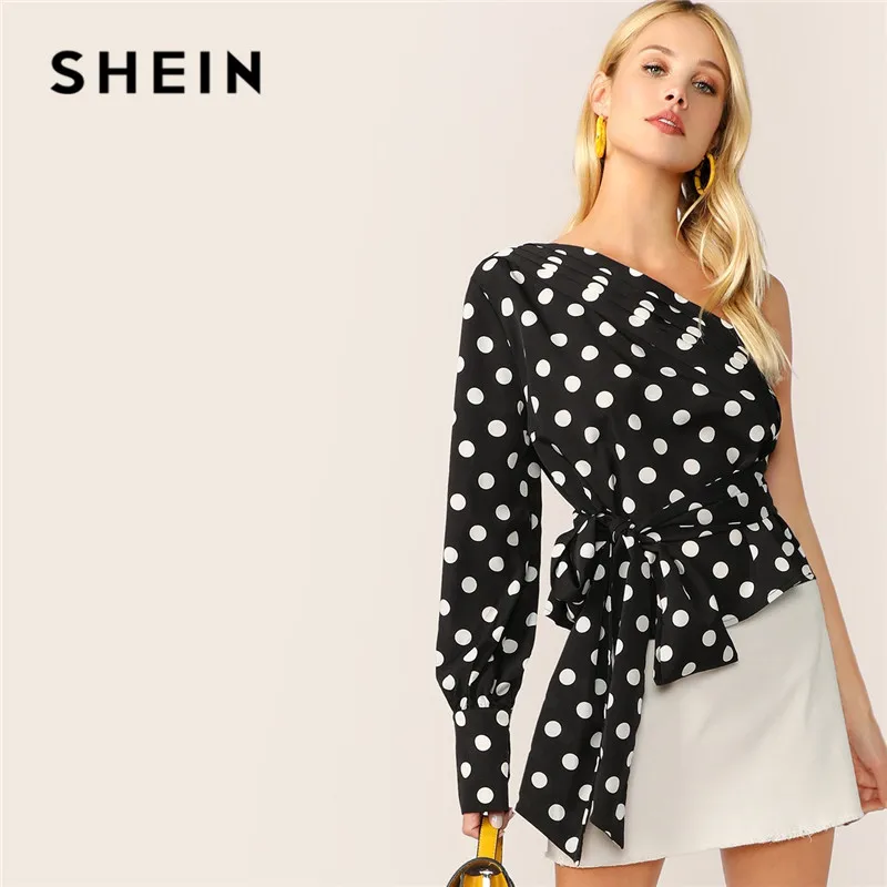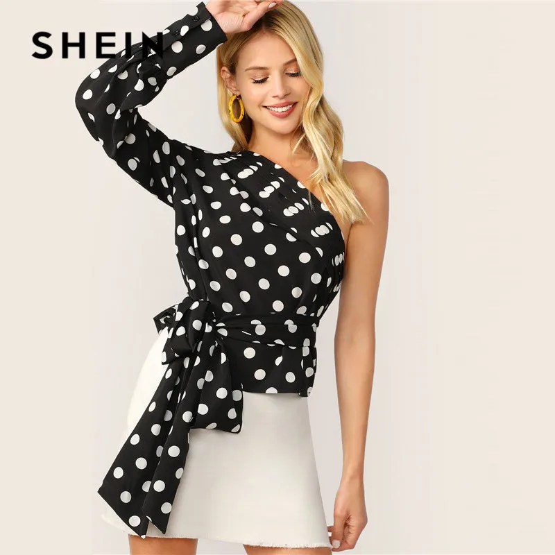 Special Offer SHEIN Блузка С Поясом На Одно Плечо Нарядная Блузка В Горошек С Длинным Рукавом 2019 Discount 48% Today!