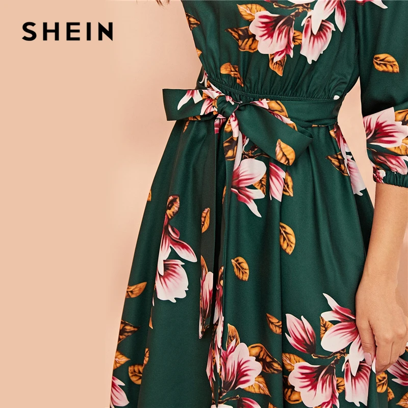 (48% Off) Купить Шеин зеленый абайя эластичный пояс Флористический с высокой талией платье для женщин Весна Осень Бишоп рукав расклешенные элегантные длин... Цена Дешево
