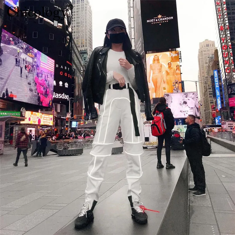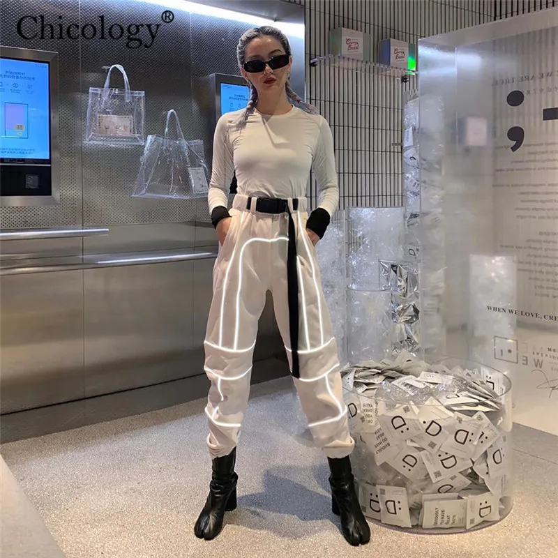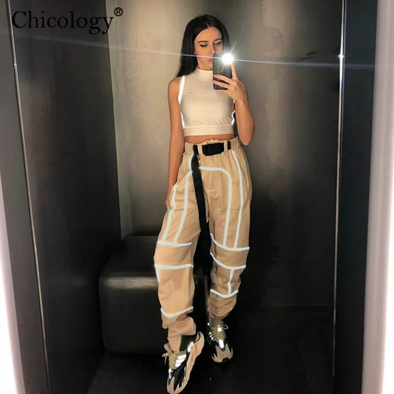 Special Offer Chicology Пряжка ремень флэш светоотражающие полосы уличная длинные брюки Высокая талия женские брюки 2019 осень зима женская одежда Discount 50% Today!
