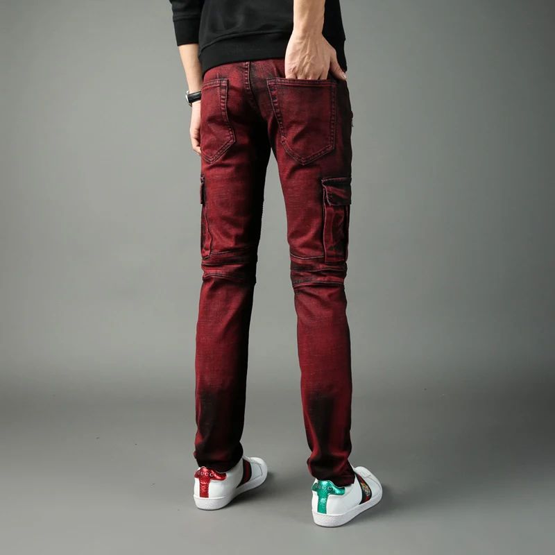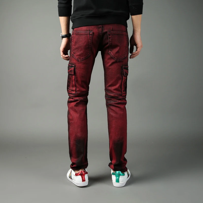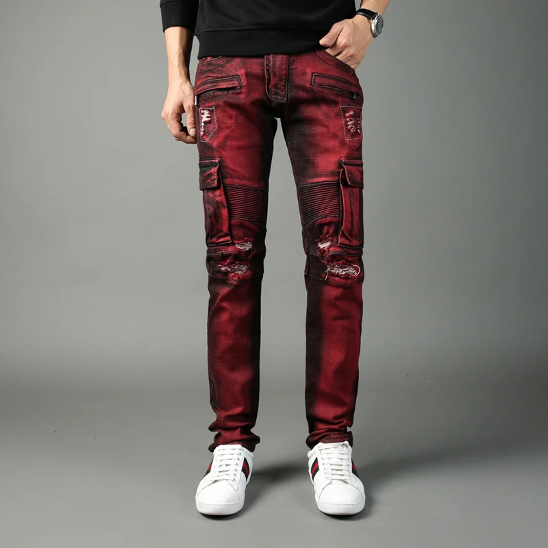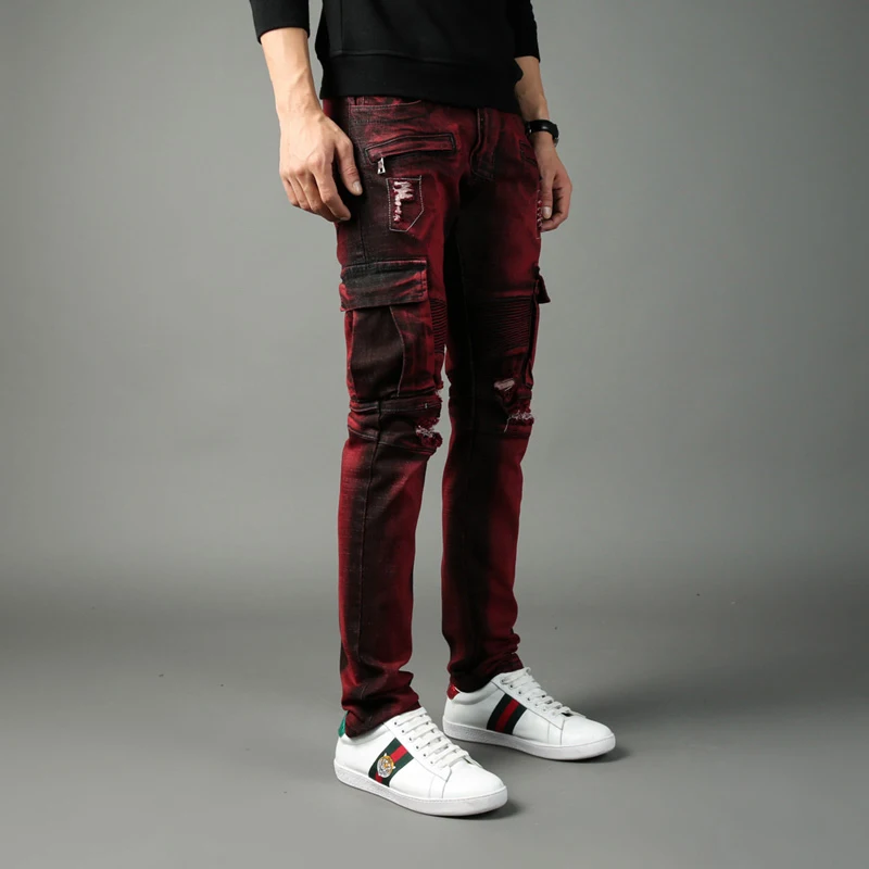 (56% Off) Купить Высокая уличная мода мужские джинсы хип хоп с большими карманами джинсовые брюки карго Hombre красный цвет зауженный крой рваные джин... Продажа Дешево