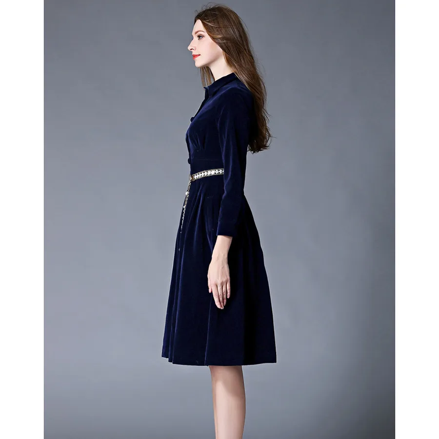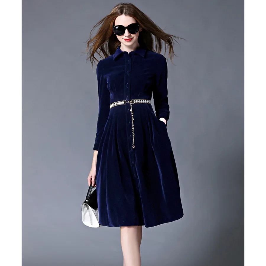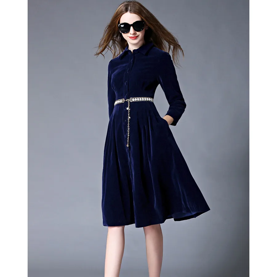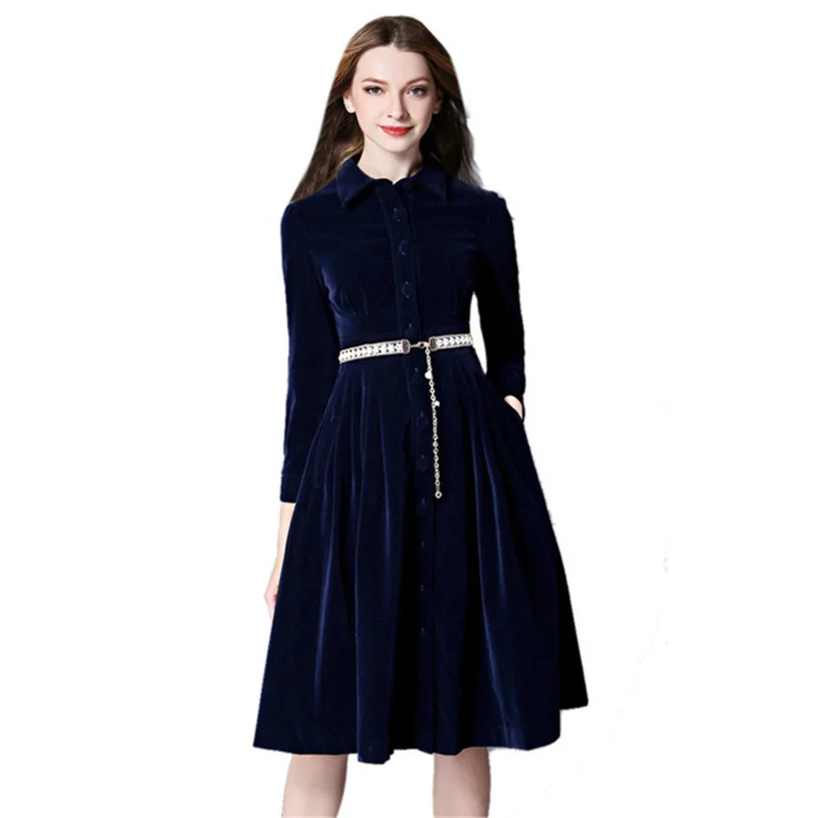Special Offer Женское бархатное платье с рукавами 3 4, отложным воротником и карманами для вечеринок, платье с поясом для подиума, Осень зима 2018 Discount 10% Today!
