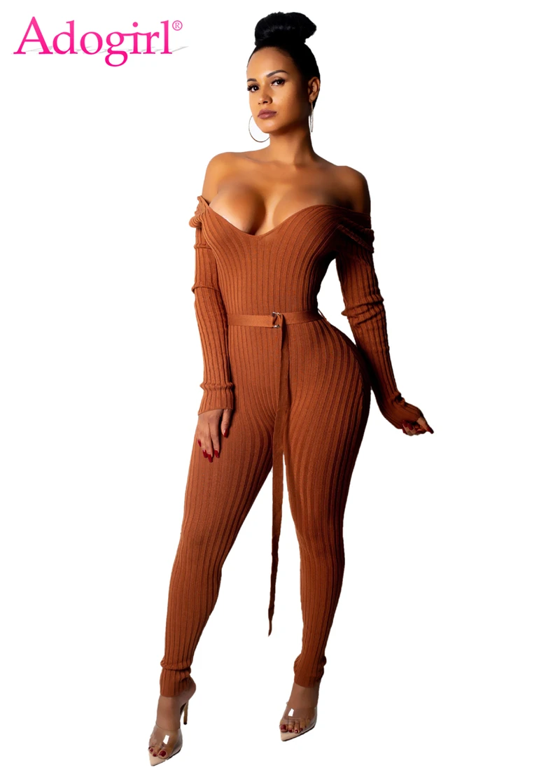 Special Offer Женский трикотажный комбинезон Adogirl, однотонный комбинезон в рубчик с открытыми плечами и поясом, с v образным вырезом и длинными рукавами Discount 20% Today!